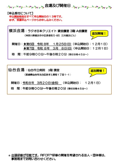 ※ 受講料をお振込みいただいたRIFCR™研修に参加できなくなった場合、参加予定だった研修の1か月以上前にお申し出いただいた場合に限り、研修日の振替希望をお受けいたします。すでに、振替先の研修が満席の場合は、キャンセル待ちの最下位に登録させていただきます。従って、受講できない場合もございます。受講できなくても、ご入金いただいた受講料は返金いたしません。
