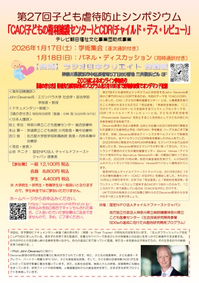 第27回子ども虐待防止シンポジウムにお招きするJohn Devaney教授のご専門がCACとCDRであるため、今回のテーマを「CACとCDR」としました。CAC(子どもの権利擁護センター)とは、人権侵害を受けたことが疑われる子どもたちに「司法面接」「系統的全身診察」「こころのケア」の3つのサービスを提供するワンストップセンターです。CDR(チャイルド・デス・レビュー)とは、子どもの予防可能死(Preventable Deaths)を防止することを目的として子どもの死亡の全数を検証する制度です。